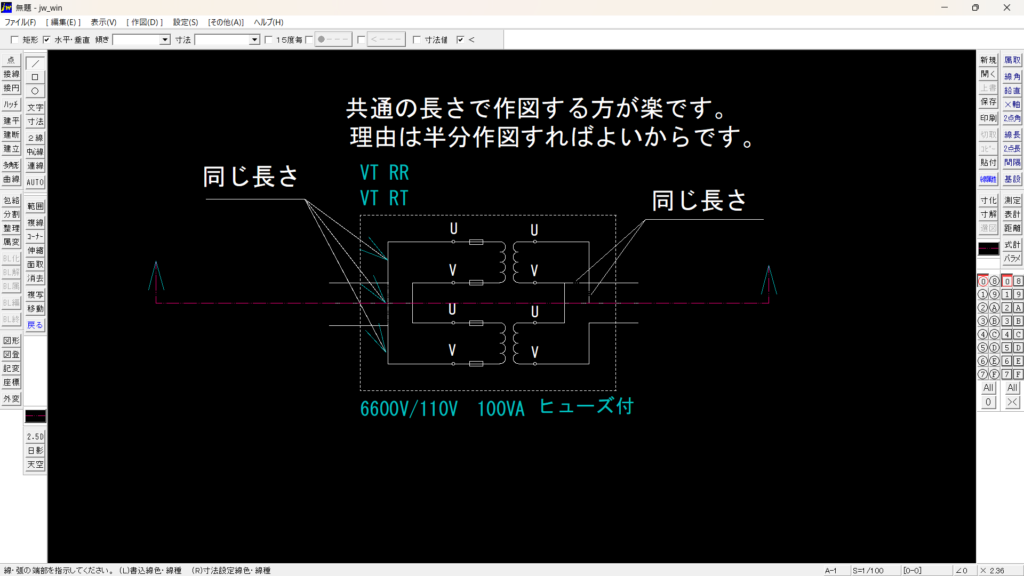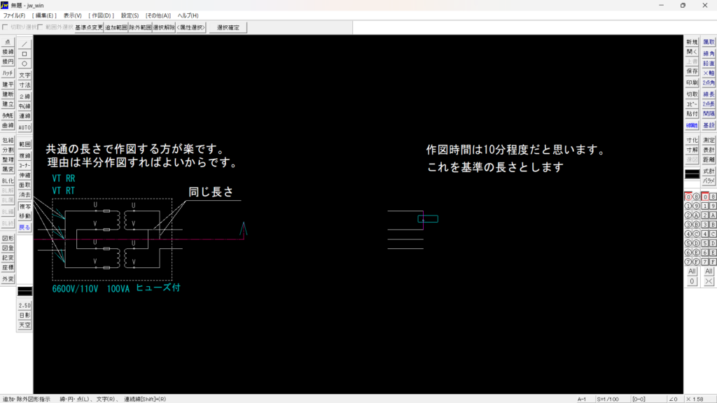 上図では半分作図とCADで書いてしまってますが、3分の1近くの作図で書けます。