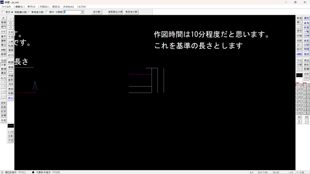 上の図は縦の基準の長さの線を引いて、横線を2本作図している画面です。