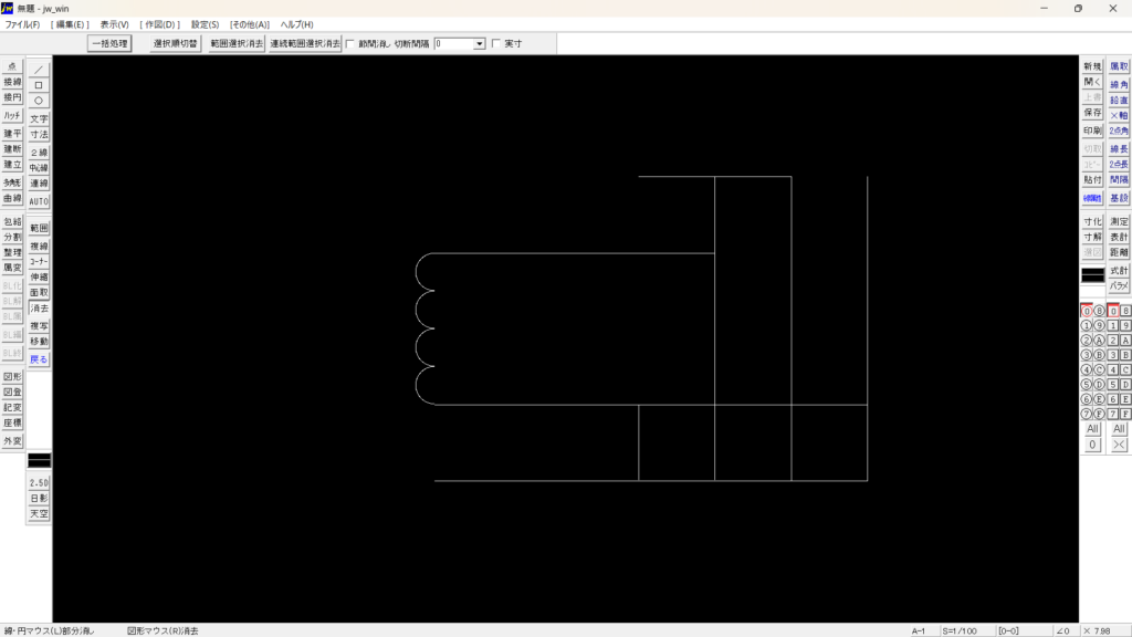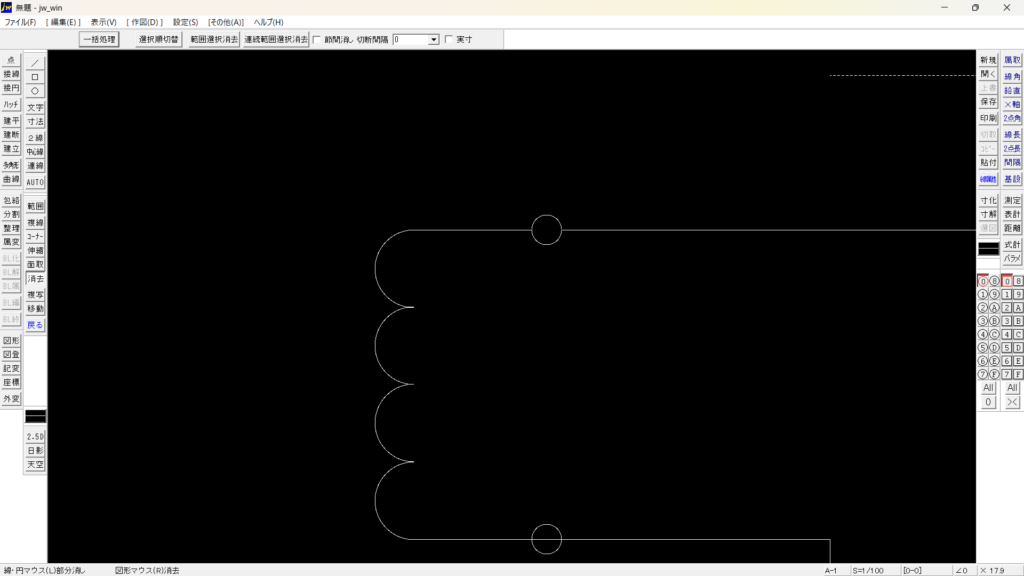 上図では、破線になる部分の更に右に基準の長さの1/2幅に縦線を複線コマンドで増やしています。