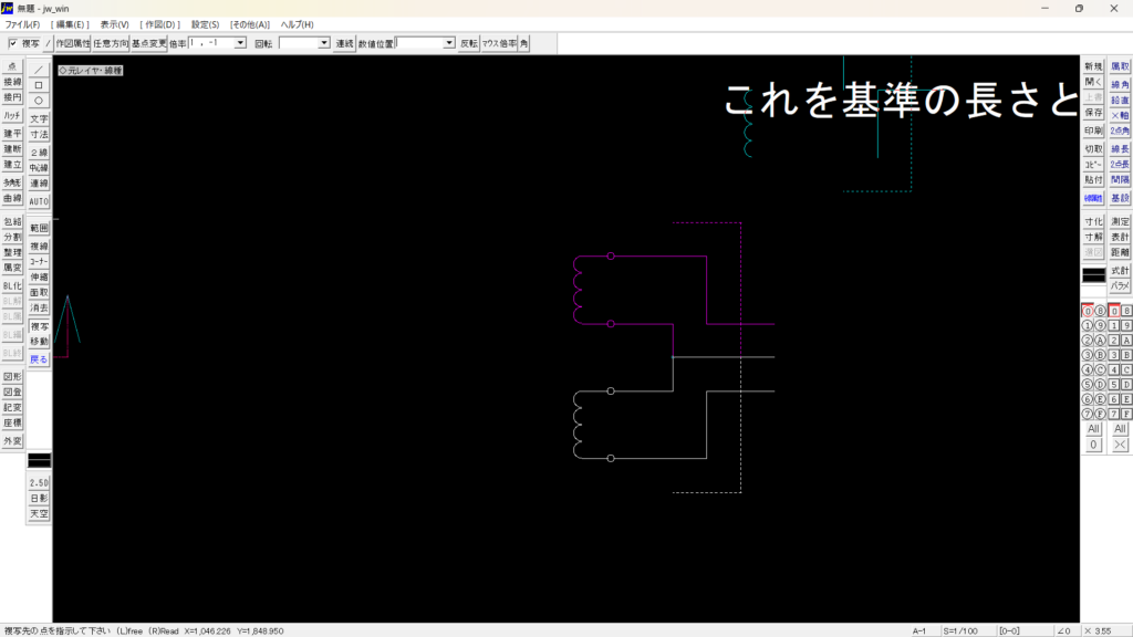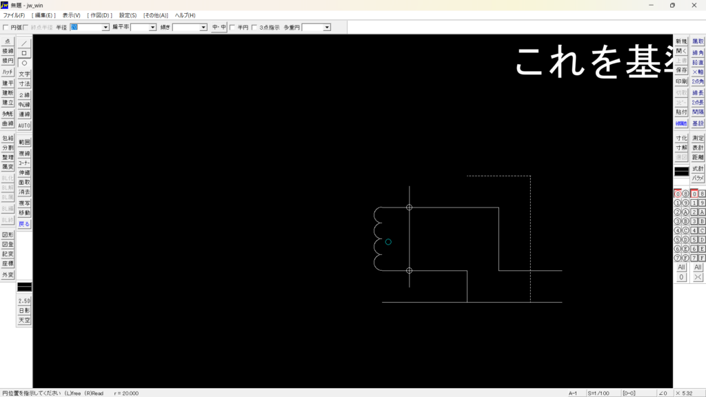 上図は、基準線を90°回して配置した後に、破線部分の右の縦線を作図しています。一番下の横線の位置に合わせるために、スナップ(右クリック)で線の長さを設定しています。