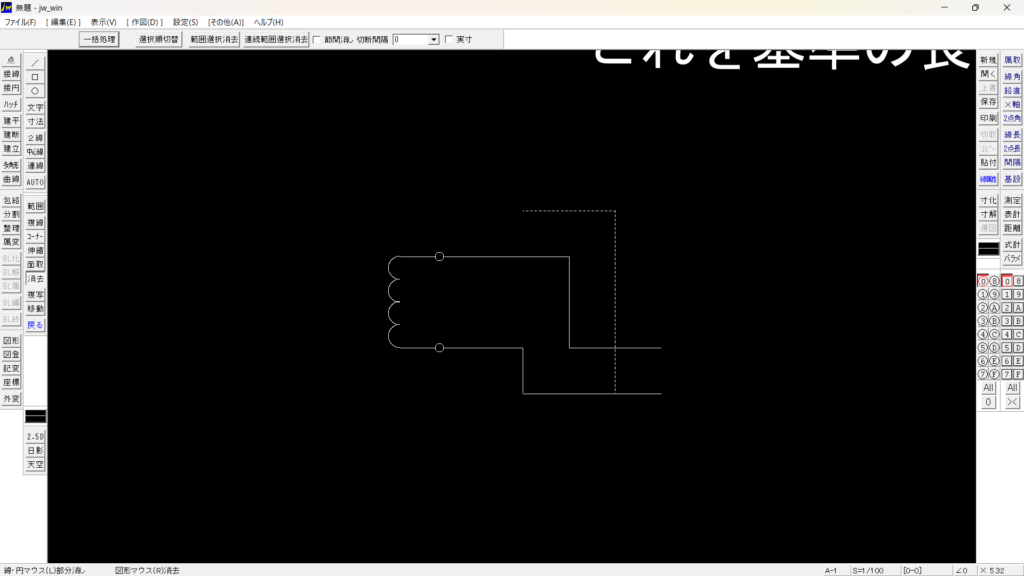 横線の左端にコイルマークの波線を後ほど作成します。今作成されている線は何処なのか把握してください。