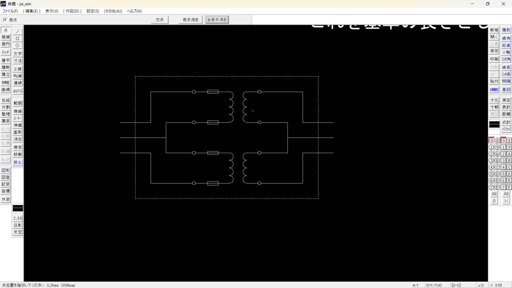 ヒューズの矩型□を作図して縦線に点の仮点で、サークルメニュー中心点、A点(サークルメニューの出し方、点コマンド→仮点にチェック→点を加えたい線の上で右ドラッグ→サークルメニュー中心点、A点でドラッグ解除。